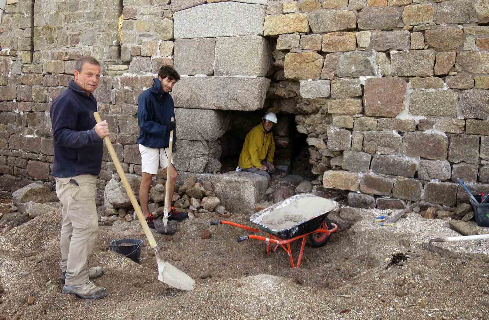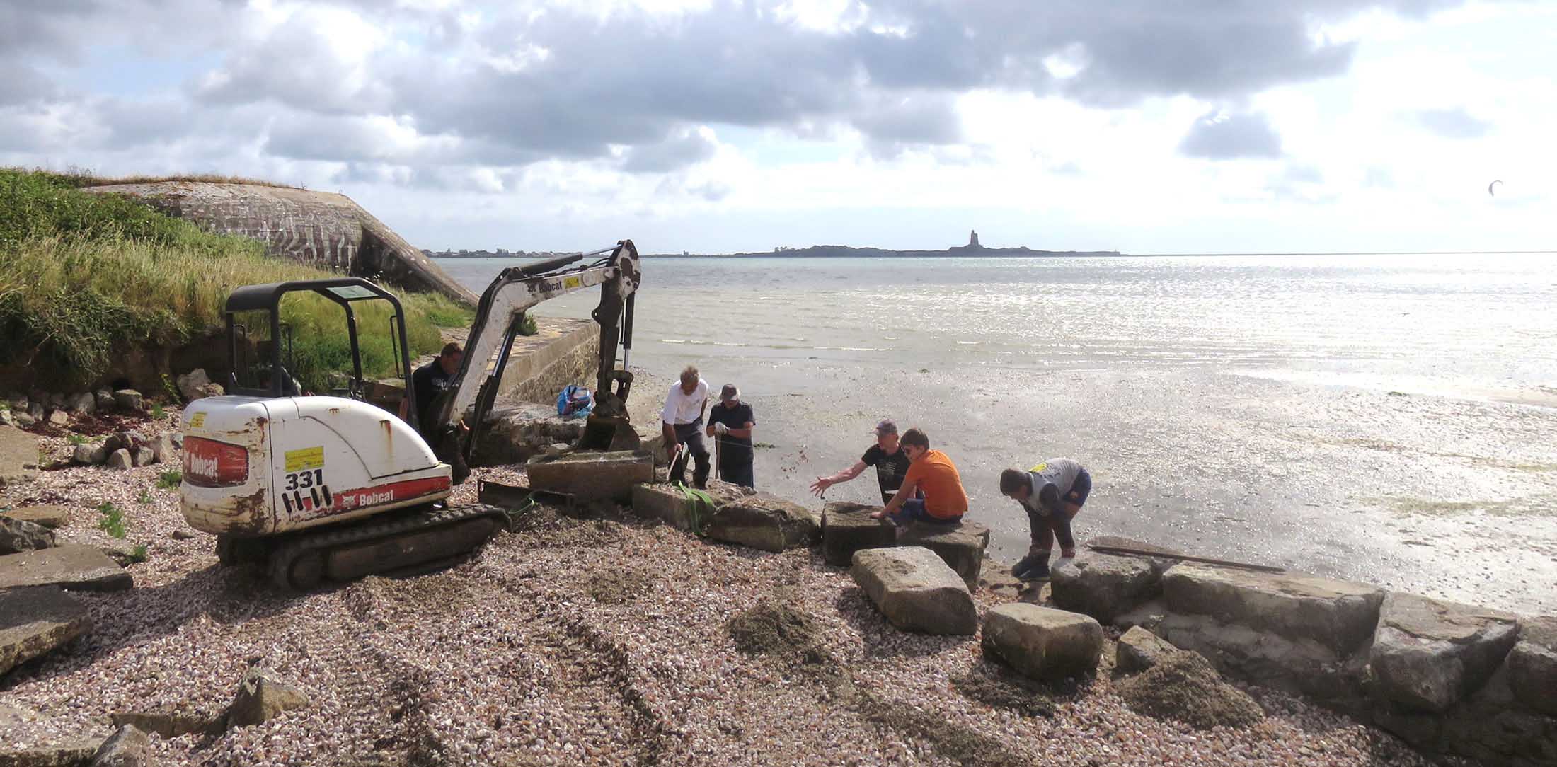 Depuis 4 ans, l’association organise au printemps un chantier de restauration d’un parapet à demi effondré à l’entrée du fort de la Hougue.